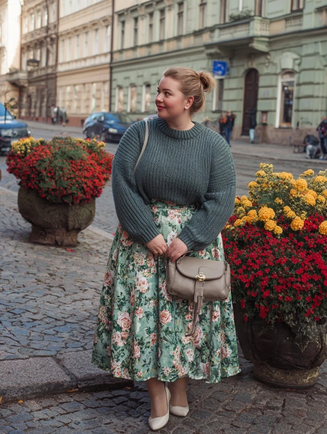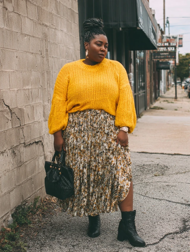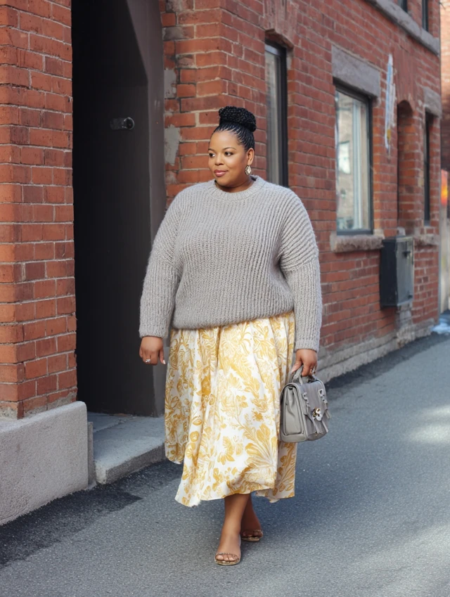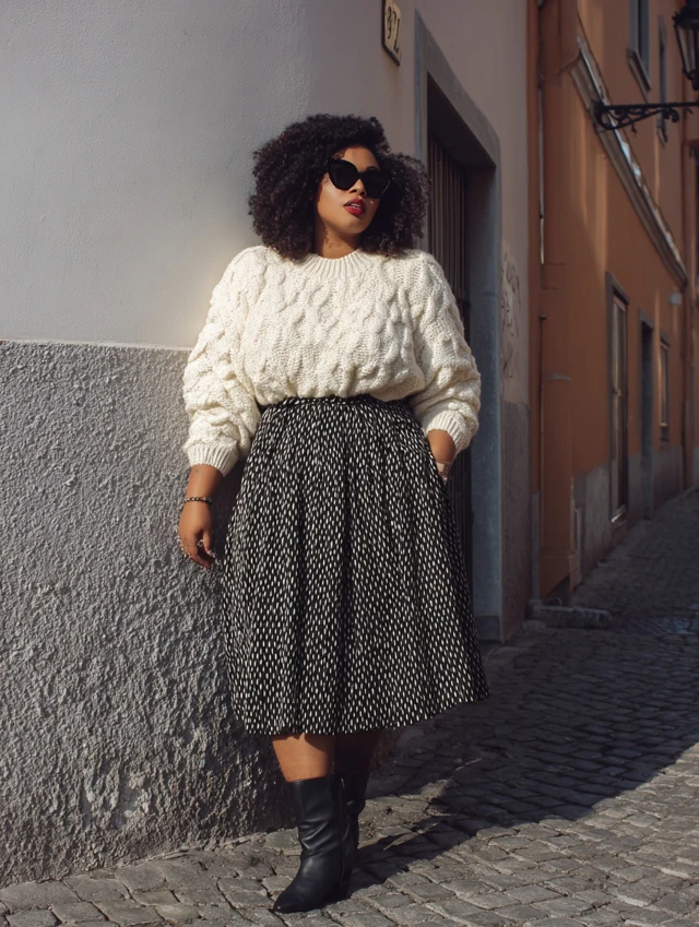 Why It Works: A-line or pleated skirts glide over the tummy, while knit sweaters balance structure with comfort.