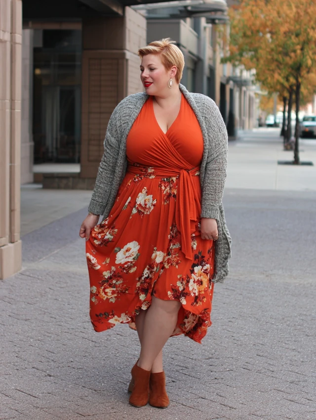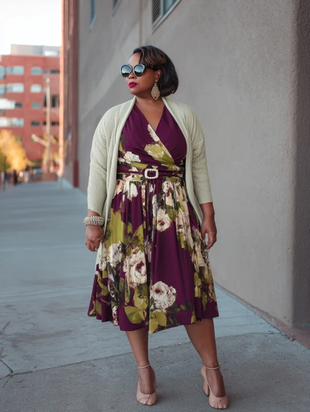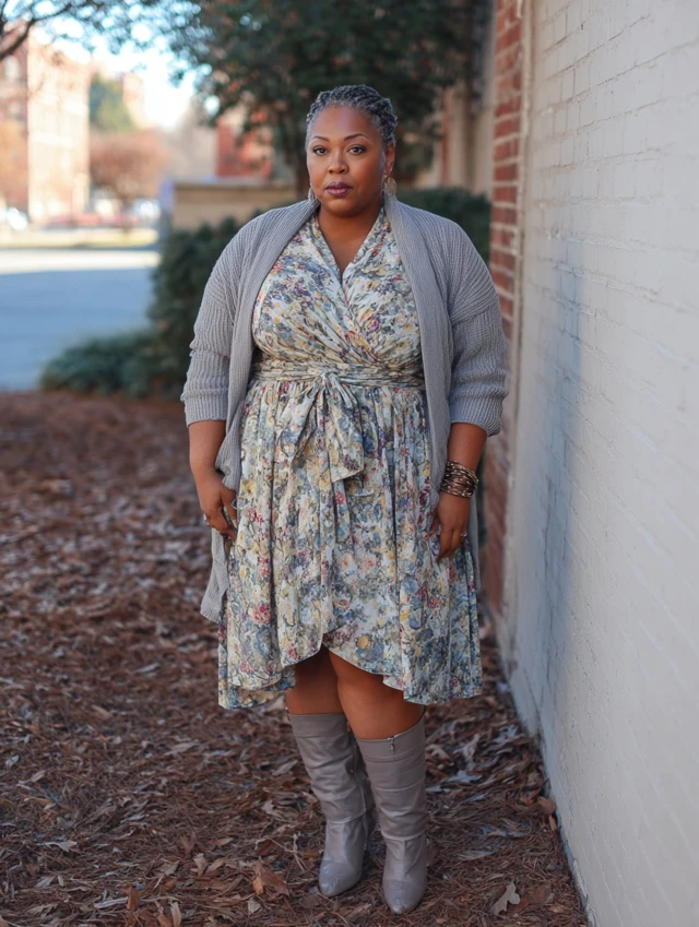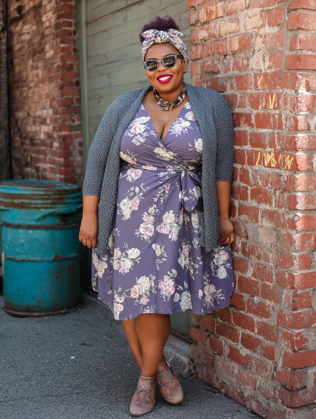 Why It Works: A wrap dress creates curves and offers freedom of movement, while a cardigan adds layers of polish.