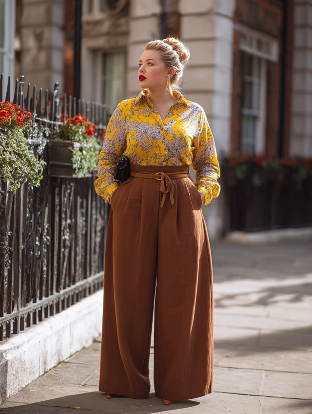 Why It Works: High-waist trousers smooth your tummy, while wide legs balance proportions and look professional.
